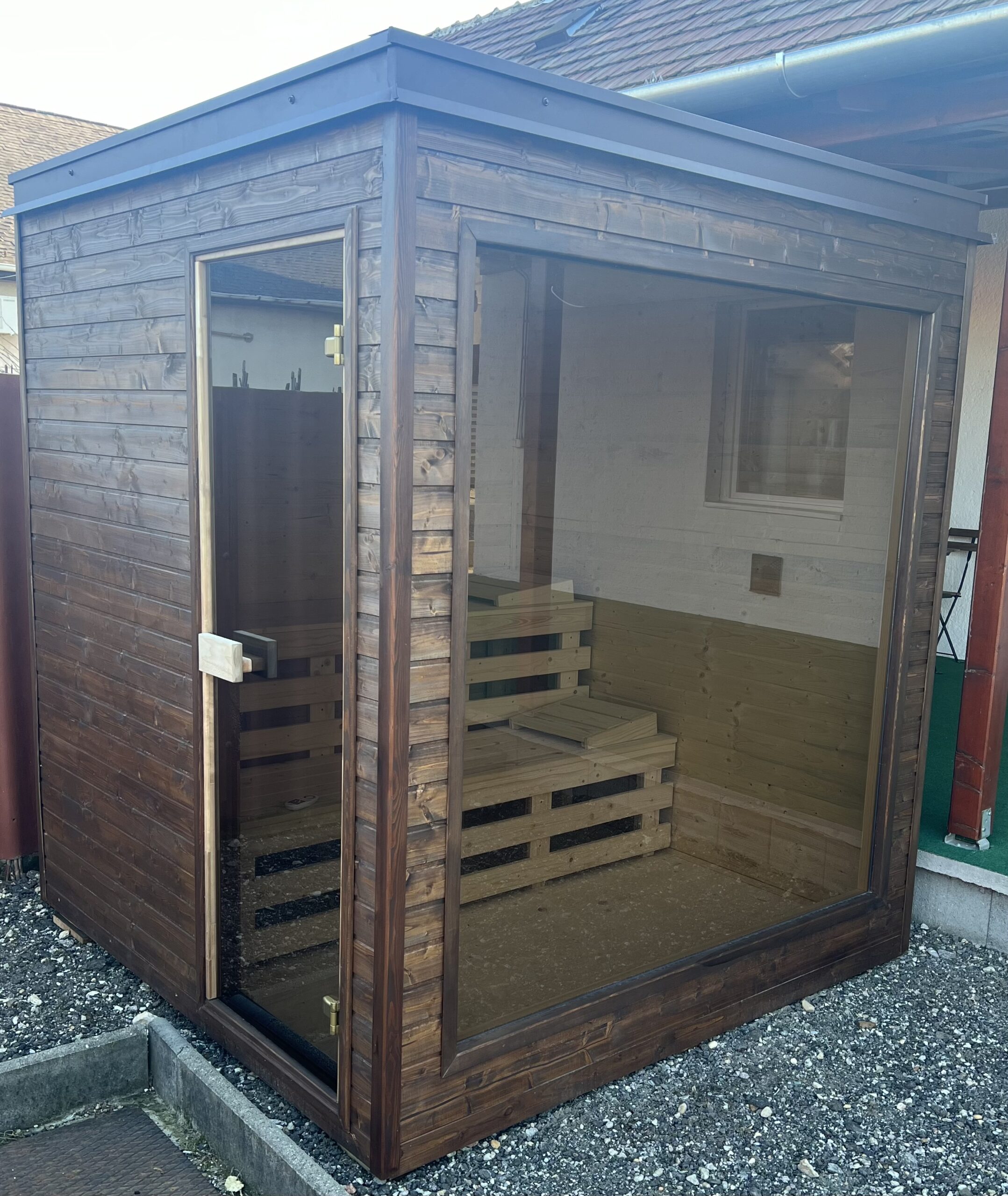 A szaunát lapraszerelt állapotban szállítjuk, és a helyszínen összeállítjuk (felár ellenében).